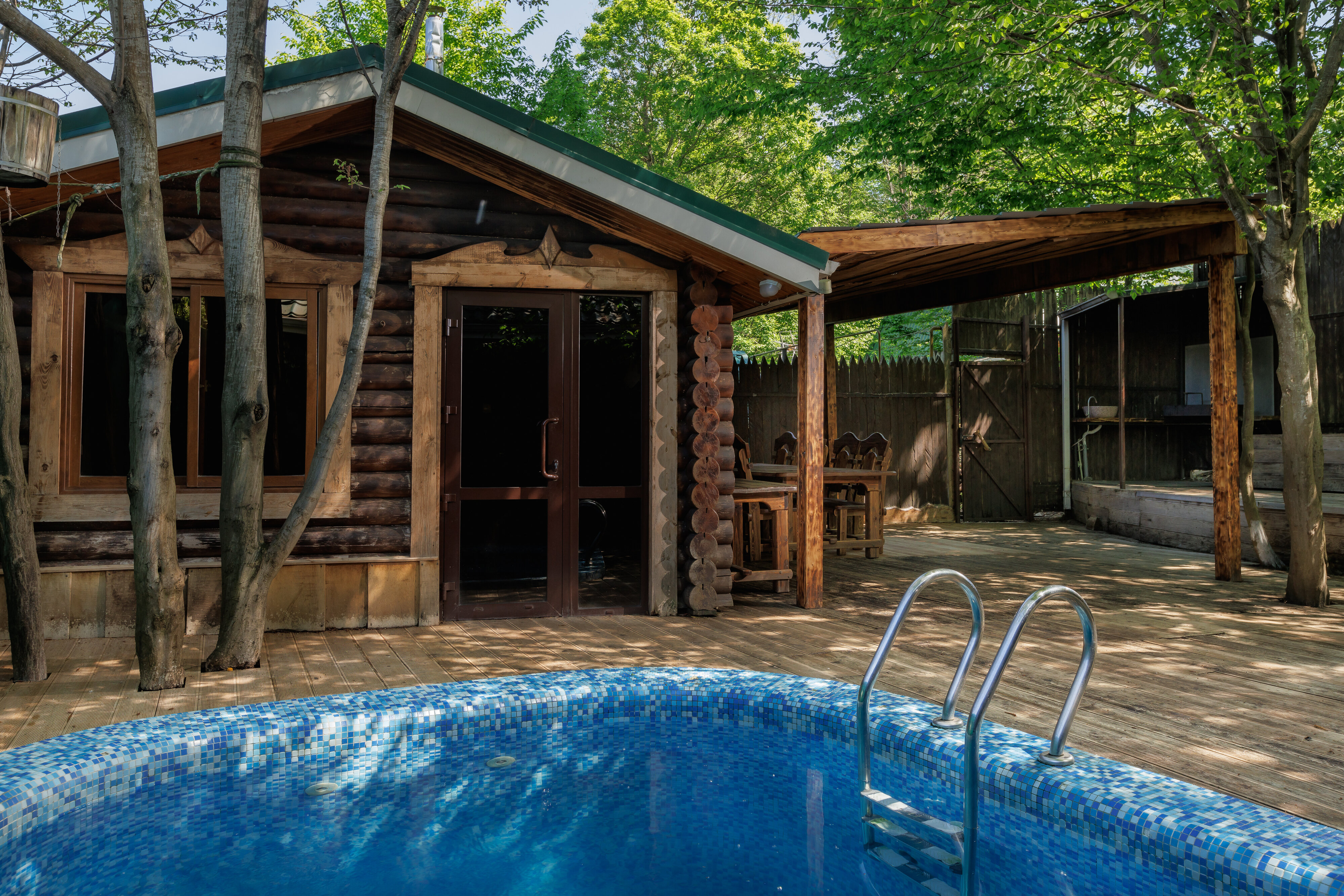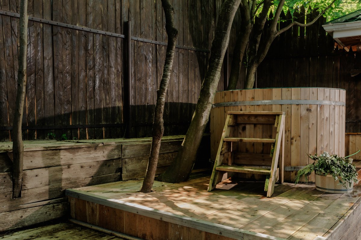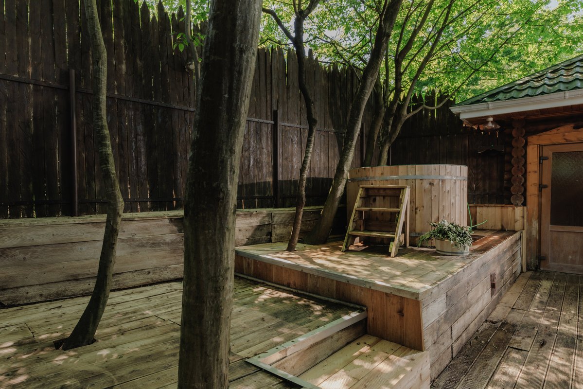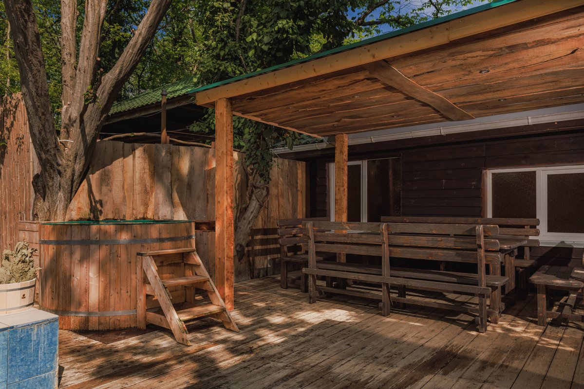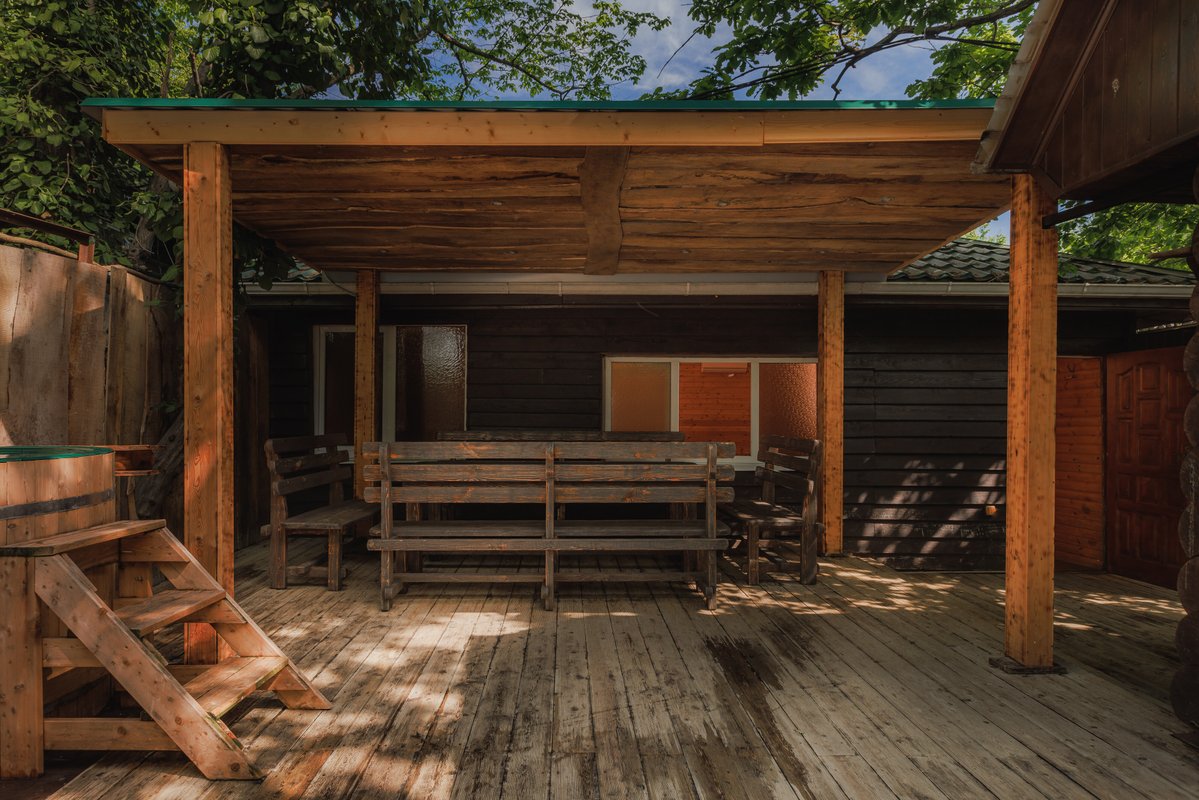 Я много раз здесь бывал, и мне очень нравится баня. Мы часто собираемся здесь компанией, просто посидеть, отдохнуть. Здесь есть мангальная зона, а также купели и чан с тёплой водой. И, что немаловажно, всё это находится рядом с нашим домом.